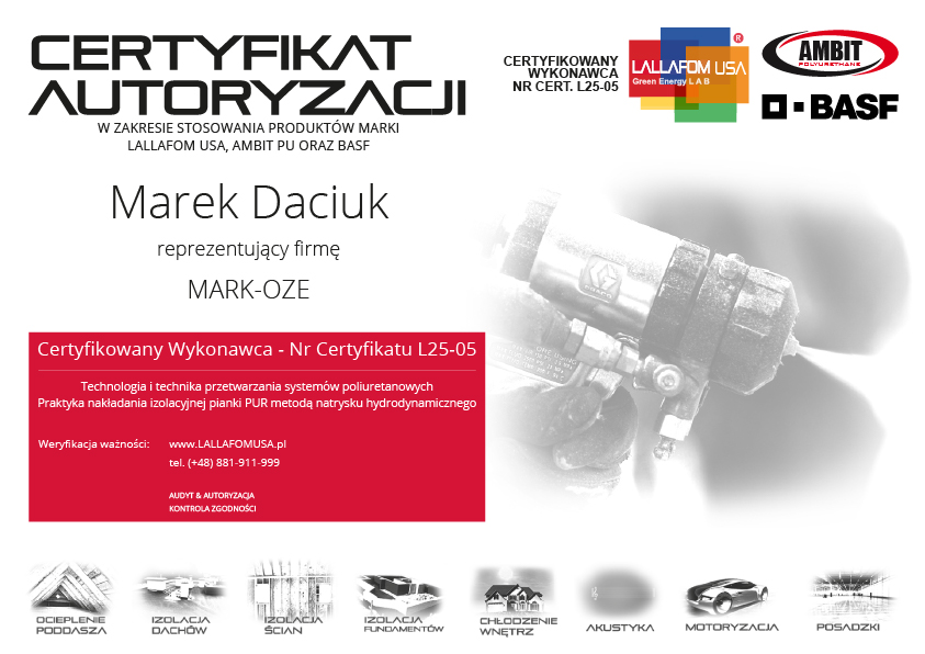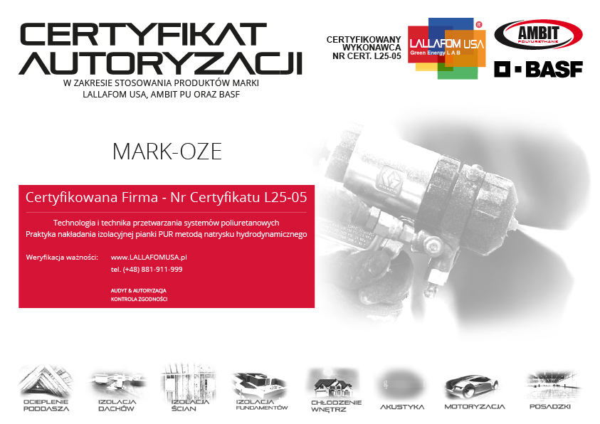 Witamy na stronie izolacji natryskowych firmy Mark-OZE. Jesteśmy Certyfikowanym Wykonawcą ociepleń w technologii poliuretanowej, reprezentowanej przez marki Lallafom USA, AMBIT PU BASF oraz KIMPUR. Celem działalności Mark-OZE jest propagowanie, oferowanie i instalacja najbardziej efektywnych, niezawodnych i ekologicznych rozwiązań izolacyjnych dla budownictwa w postaci rewelacyjnego systemu ociepleń, jaki stanowi technologia natrysku pianek PUR. Jesteśmy pewni, że przyczyniamy się do podniesienia poziomu świadomości inwestycyjnej i satysfakcji naszych klientów, a każda wykonana poliuretanowa izolacja natryskowa niewątpliwie stanowi ważny element korzystniejszego bilansu energetycznego w globalnej skali – od pojedynczej inwestycji do całej gospodarki zasobami energii.